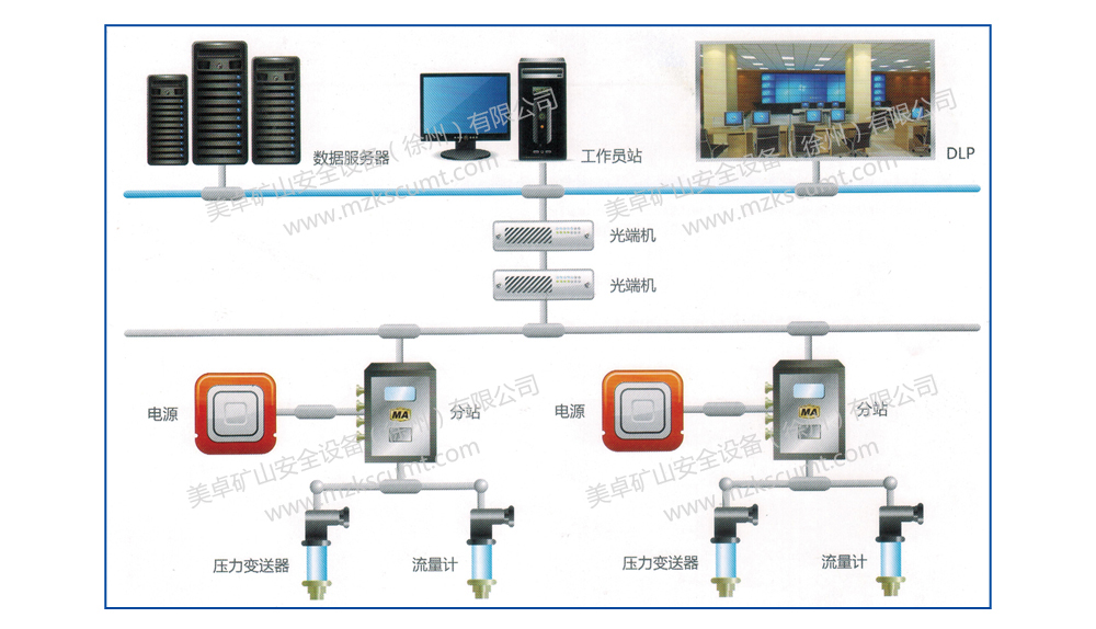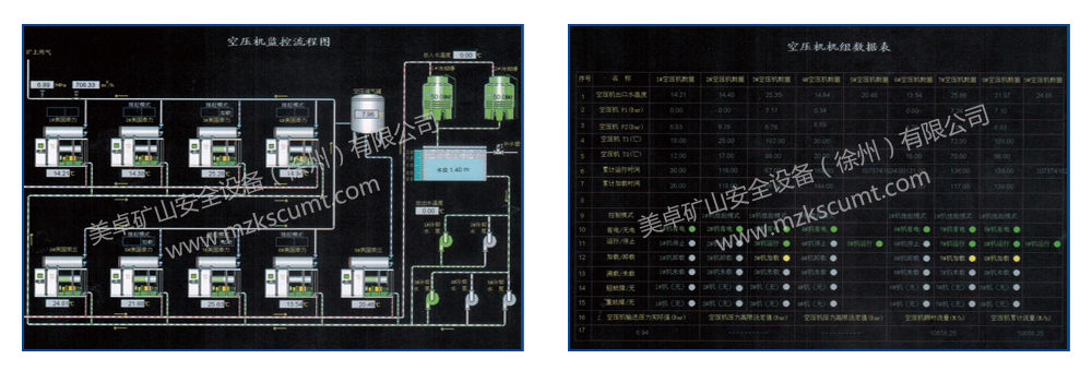 ●顯示功能:在地面集控室由工控機(jī)顯示各壓風(fēng)管路壓力、各供水管路流量。設(shè)有各設(shè)備的故障信號(hào)顯示,并伴有報(bào)警。